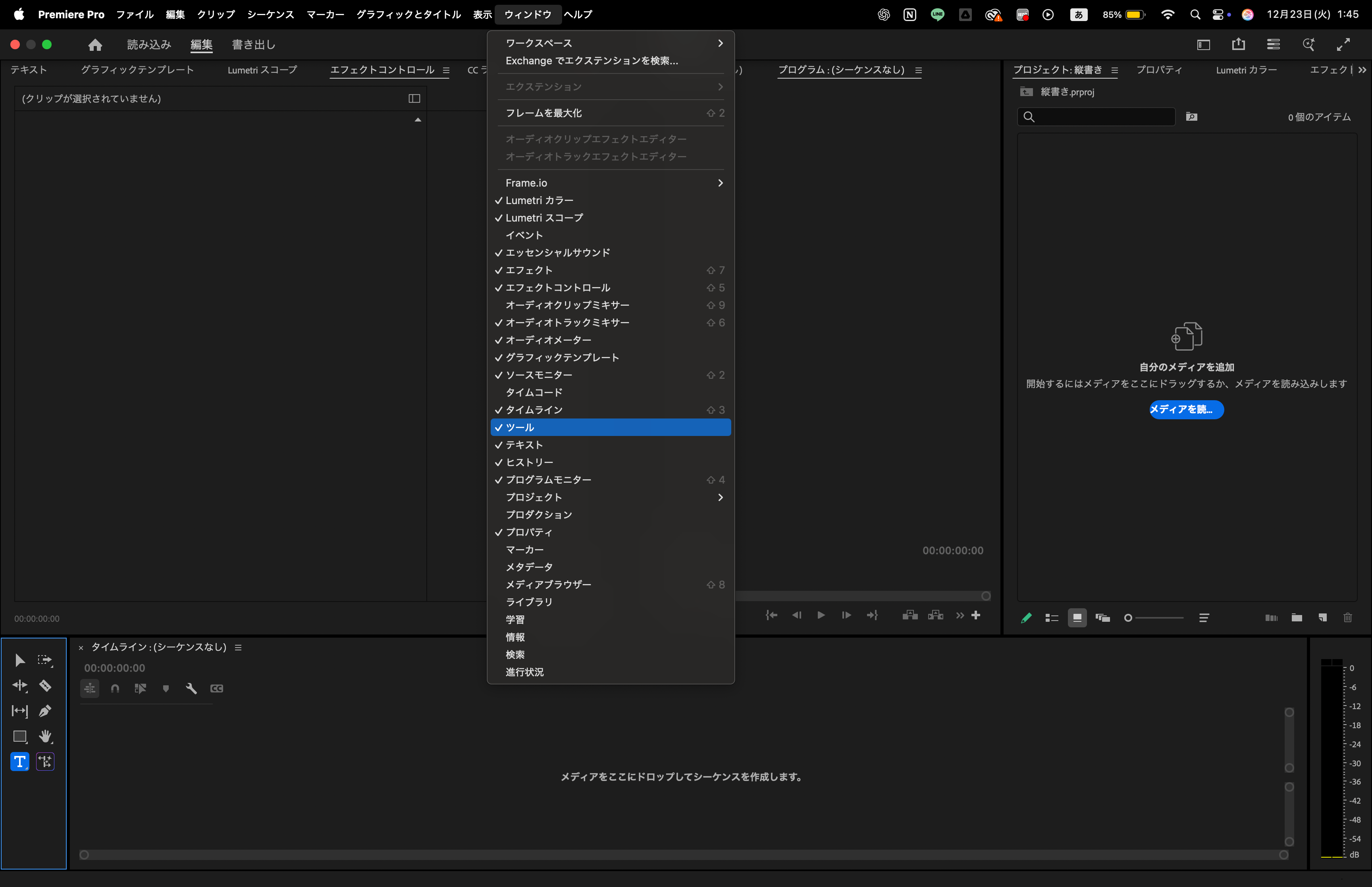 まずは画面上部のメニューバーからウィンドウをクリックし、ツールにチェックが入っていることを確認してください。