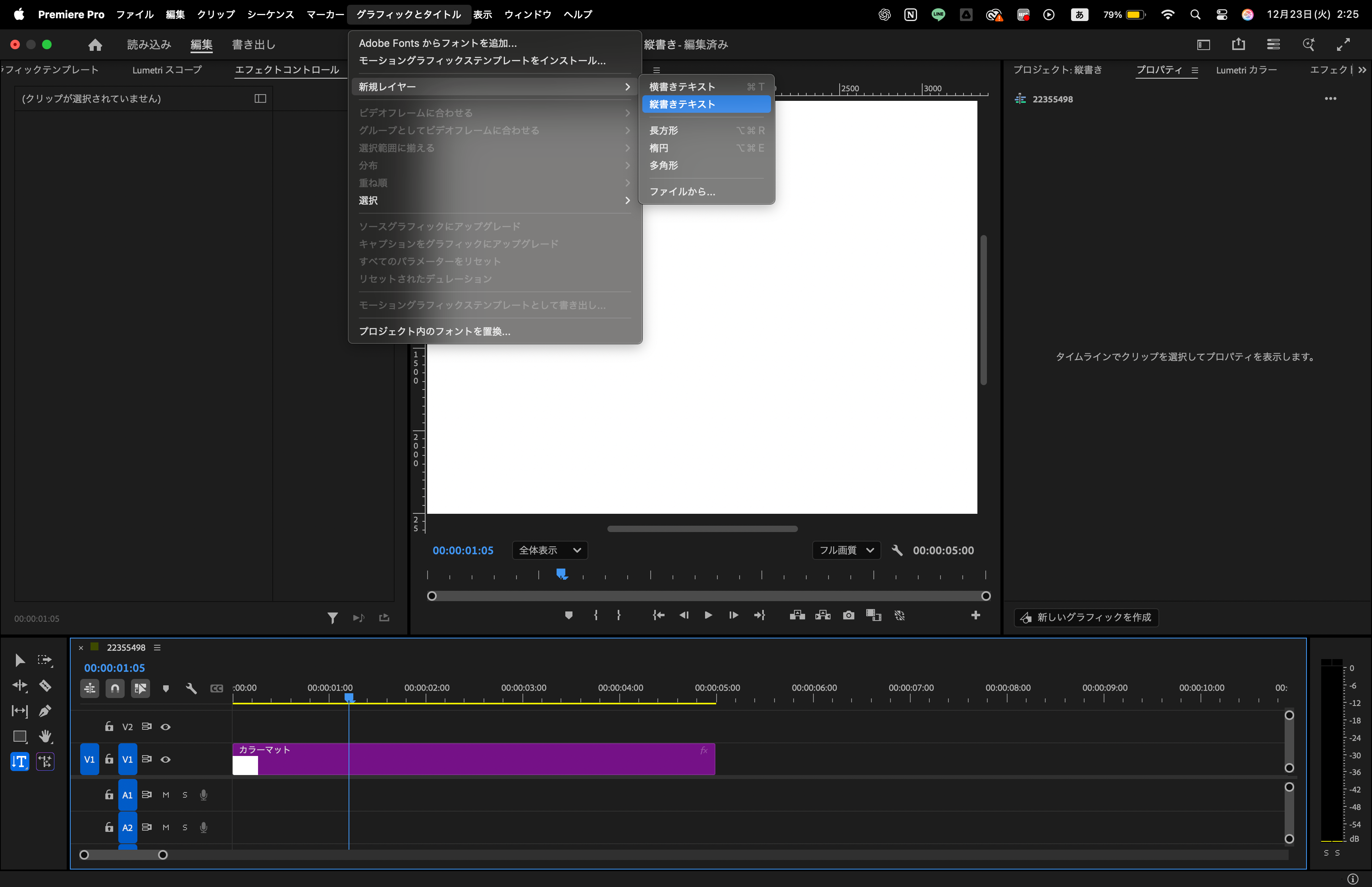 シーケンスに青枠がついたら、画面上部のメニューバーからグラフィックとタイトルを選びます。