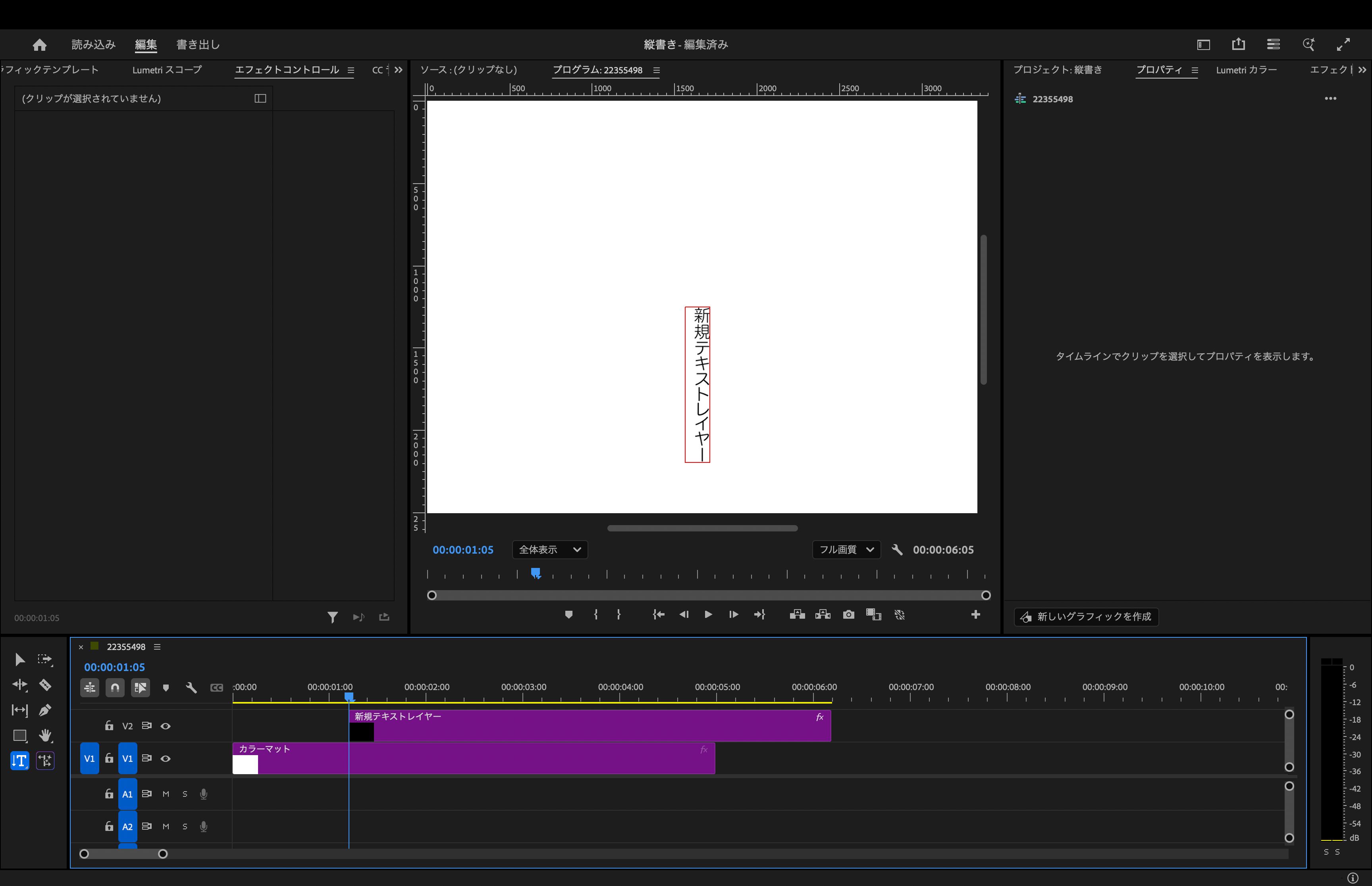 新規レイヤーの中の縦書きテキストをクリックすると、シーケンス内に縦書きのテキストボックスが追加されます。